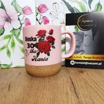 Pełen energii, błysku i humoru – idealny prezent dla.Kubek 330ml z wieczkiem i korkowym spodem "Boska 30 + imię"