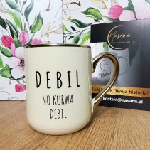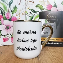 Ten kubek to doskonały przykład kontrastu: z pozoru spokojny, wręcz „folklorystyczny” – a jednak mocny i wyrazisty.