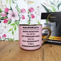 59,00 zł -10,01 zł PROMOCJA!!! 48,99 złElegancki kubek z napisem „Władca wszystkiego – Kierowniczka” (Małgorzata). Tekst widoczny z obu stron. Idealny prezent dla pewnej siebie kobiety – szefowej, liderki, mistrzyni.